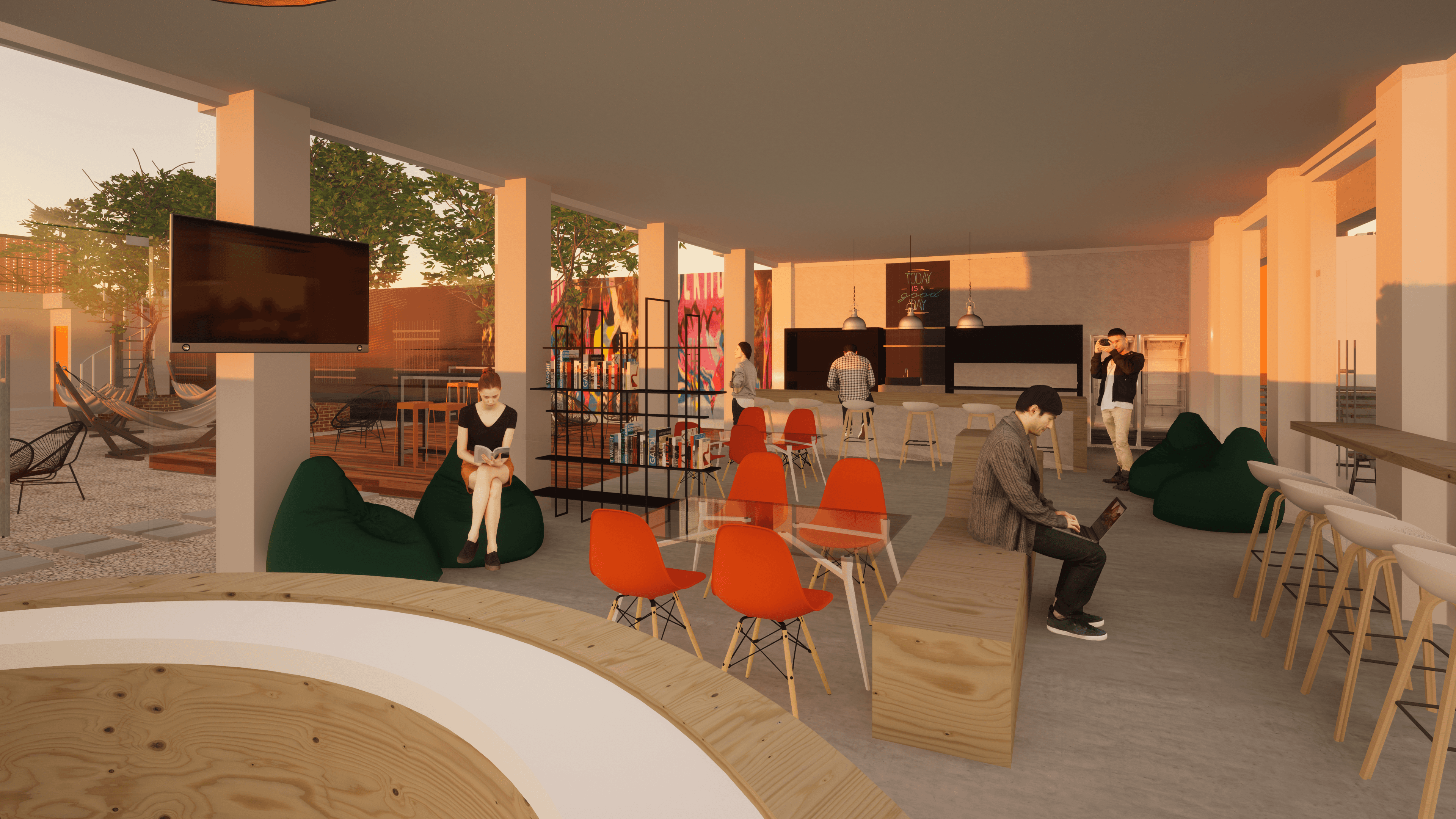 En una segunda etapa, cuándo el edificio ya estuvo a punto, intervenimos la cafetería y el patio, con la intención de dar la bienvenida a los alumnos desde un espacio abierto, acogedor y agradable.